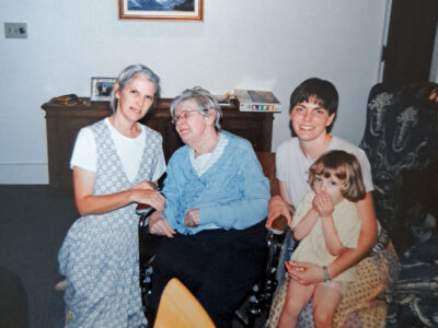 (This image shows my mother on the left, with her mother. On the right is my (younger) self with my daughter – 4 generations)